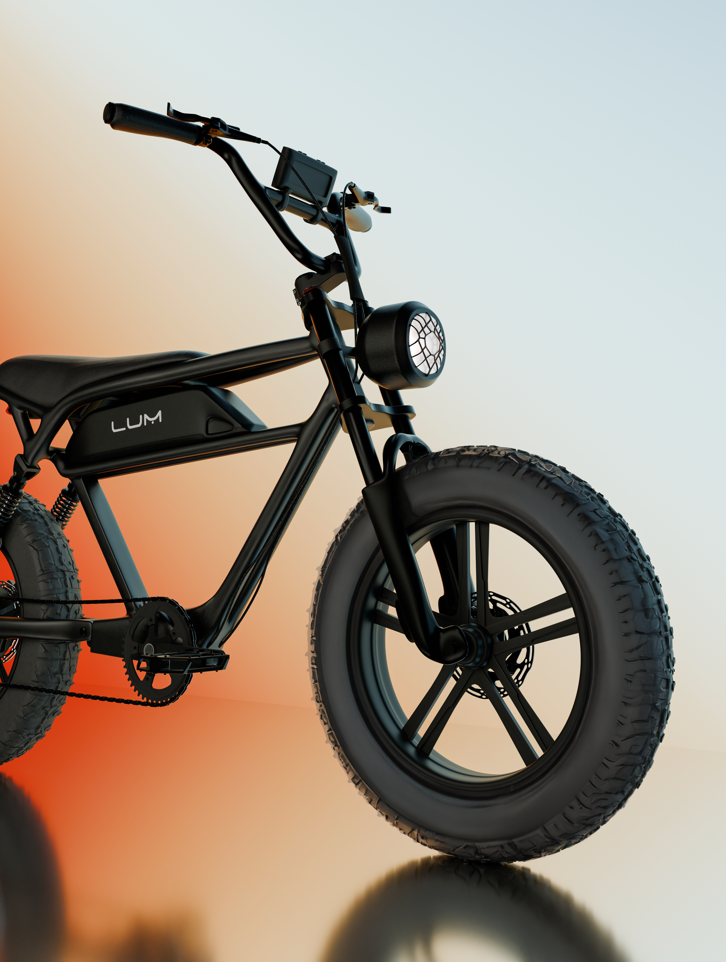 The LUM V1 redefines urban exploration with its sleek, intuitive design, built for speedand comfort. Inspired by the shape of a speed bolt, the V1's frame is engineered for agility and power. Its extended saddle, designed for exceptional comfort, adapts to different rider physiques. Paired with powerful fat tires, the V1 delivers a smooth and exhilarating ride on a variety of terrains. The long-lasting battery provides extended range, ensuring you can explore further on your urban adventures. The V1 blends sleek aesthetics with cutting-edge technology, offering a powerful and comfortable riding experience perfect for navigating city streets and beyond.